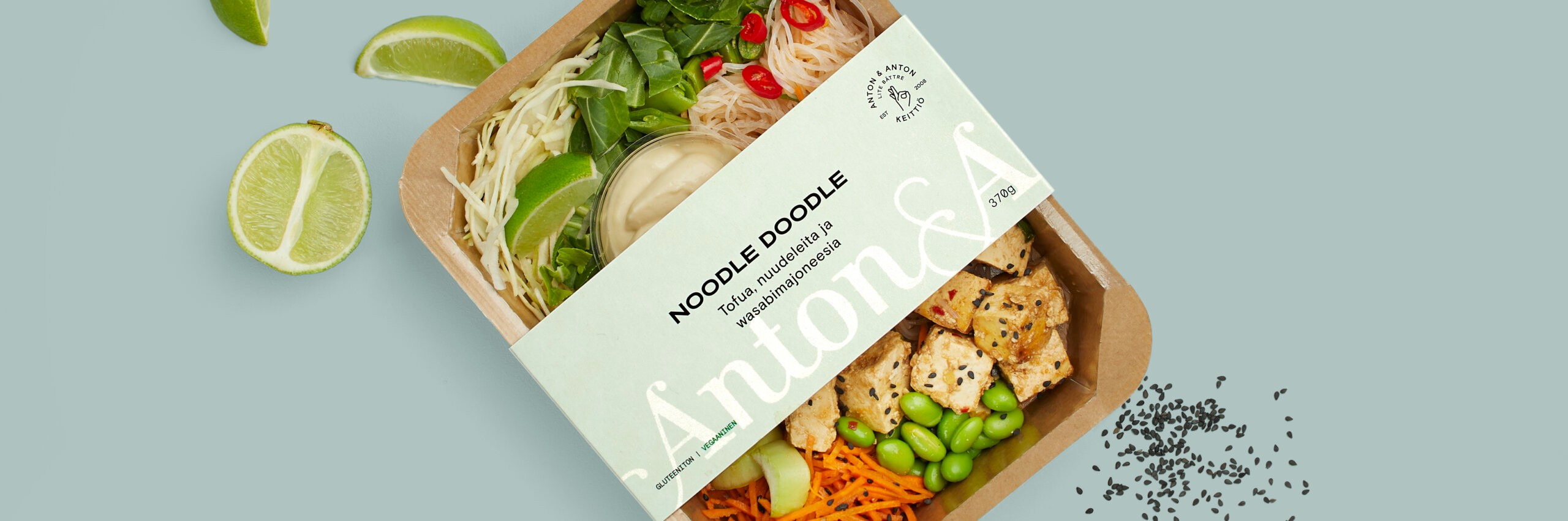 Noodle Doodle - Anton&Antonin vegaaninen klassikkoannos, jossa kotimaista Jalotofua, aasialaisittain maustettua riisinuudelisalaattia ja wasabimajoneesia. Anton&Antonin salaattiannokset ovat paitsi parhaan makuisia, myös ruokaisia ja täysipainoisia aterioita, jotka sopivat täydellisesti niin lounaaksi, palaverievääksi kuin piknikille.